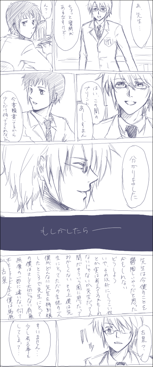 しかしどっちにしても古泉が失恋して終わりっぽくて可哀想すぎるので忙しくなくなったら教師古泉×教師キョンのガチっぽいの描きます