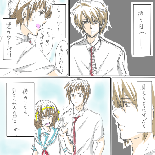ちなみに古泉が猫背っぽいのはちょっと屈んでキョンの腰を引きよせてて、キョンは古泉のシャツにしがみついてるだけなのでキョンからしたわけじゃないですよ