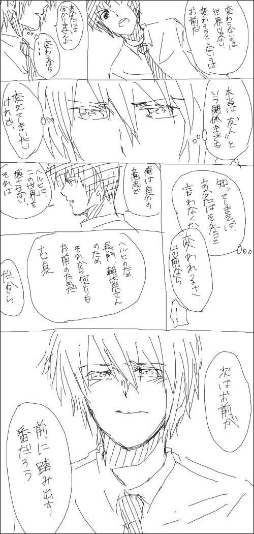 あと古泉はよくある本心を見せない敬語+笑顔キャラだけど他と違うのは中に隠してるのが腹黒さじゃなくてもっとこう、切ないものだというところだと思います(無駄にいいこと言ってるみたい)